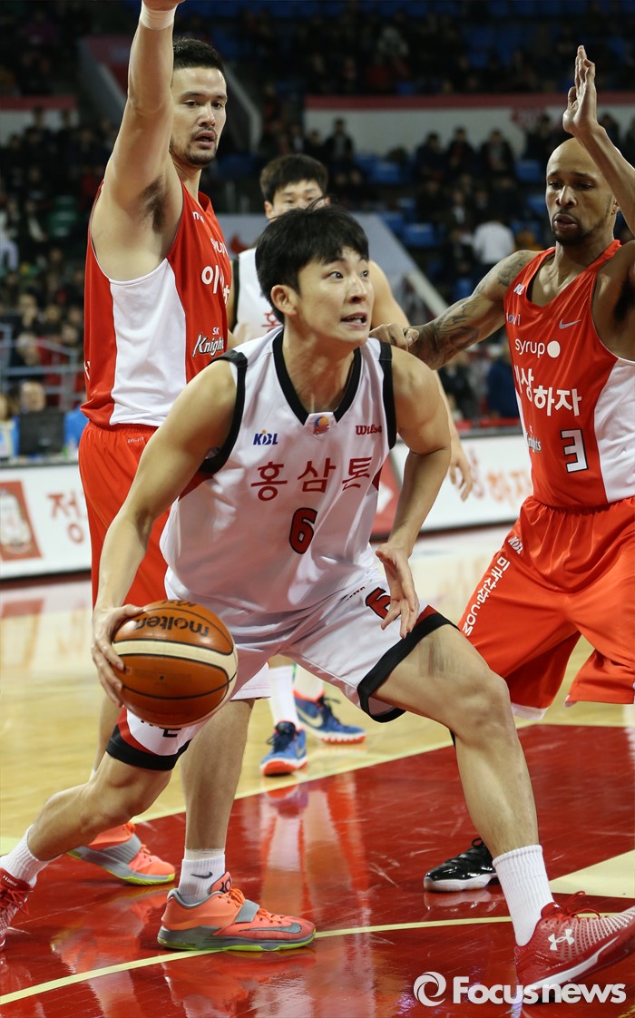 (서울=포커스뉴스) 15일 서울 잠실학생체육관에서 열린 2015-2016 프로농구 SK-KGC 경기에서 KGC 강병현이 골밑에서 SK 김민수(왼쪽)와 스펜서의 집중 마크를 받으며 슈팅을 노리고 있다.