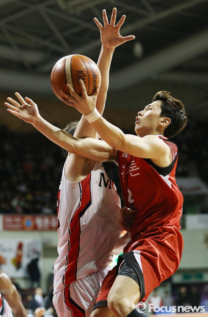 (안양=포커스뉴스) 17일 안양실내체육관에서 열린 2015-2016 프로농구 KGC-모비스 경기에서 KGC 김기윤이 모비스 함지훈의 마크를 받으며 레이업슛을 시도하고 있다.