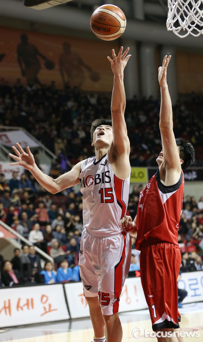 (안양=포커스뉴스) 17일 안양실내체육관에서 열린 2015-2016 프로농구 KGC-모비스 경기에서 모비스 배수용이 KGC 양희종의 마크를 피해 레이업슛을 시도하고 있다.
