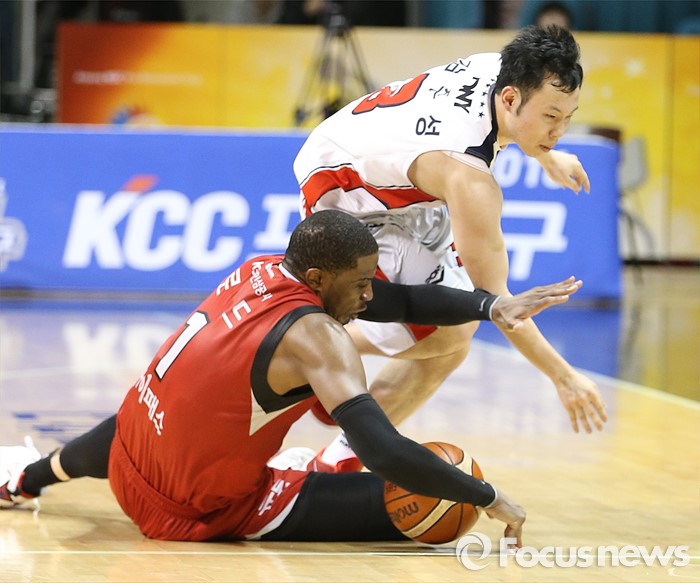 (안양=포커스뉴스) 17일 안양실내체육관에서 열린 2015-2016 프로농구 KGC-모비스 경기에서 KGC 찰스 로드가 모비스 김주성과 흐르는 공을 잡을 차지하려 경합하고 있다.