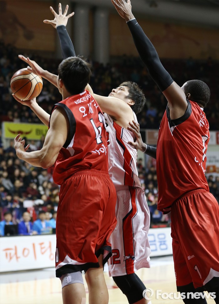 (안양=포커스뉴스) 17일 안양실내체육관에서 열린 2015-2016 프로농구 KGC-모비스 경기에서 모비스 함지훈의 골밑슛을 KGC 오세근과 찰스 로드가 저지하고 있다.