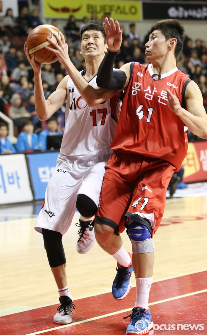 (안양=포커스뉴스) 17일 안양실내체육관에서 열린 2015-2016 프로농구 KGC-모비스 경기에서 모비스 전준범이 KGC 오세근의 마크를 받으며 레이업슛을 노리고 있다.