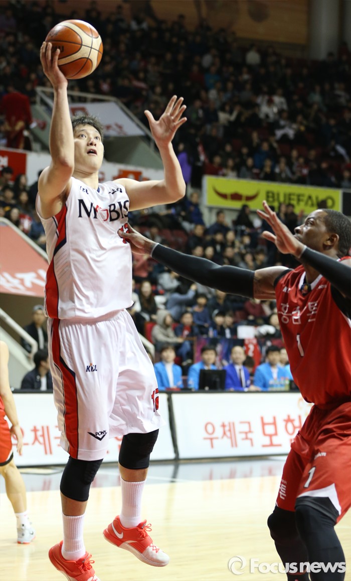 (안양=포커스뉴스) 17일 안양실내체육관에서 열린 2015-2016 프로농구 KGC-모비스 경기에서 모비스 함지훈이 KGC 찰스 로드를 앞에 두고 레이업슛을 시도하고 있다.