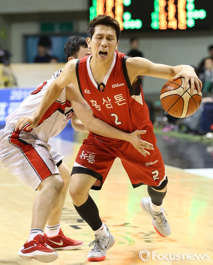 (안양=포커스뉴스) 17일 안양실내체육관에서 열린 2015-2016 프로농구 KGC-모비스 경기에서 KGC 김기윤이 돌파를 시도하다 모비스 김주성에게 저지당하고 있다.