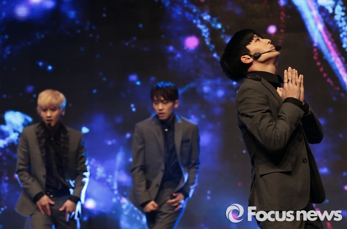 (서울=포커스뉴스) 18일 오전 서울 강남구 일지아트홀에서 열린 아이돌 그룹 틴탑의 미니앨범 'RED POINT' 쇼케이스에 참석한 멤버 엘조(오른쪽)이 신곡 '사각지대'의 무대를 선보이고 있다.