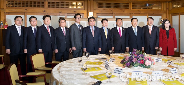 (서울=포커스뉴스) 19일 오전 서울 종로구 삼청동 국무총리공관에서 열린당·정·청 정책조정협의회에서 왼쪽부터 안종범 청와대 경제수석, 이기권 고용노동부 장관, 권성동 새누리당 전략기획본부장, 조원진 새누리당 원내수석부대표, 이준식 사회부총리 겸 교육부 장관, 원유철 새누리당 원내대표, 현정택 청와대 정책조정수석, 유일호 경제부총리 겸 기획재정부 장관, 김정훈 새누리당 정책위의장, 이석준 국무조정실장, 김현숙 청와대 고용복지수석이 기념촬영을 하고 있다.