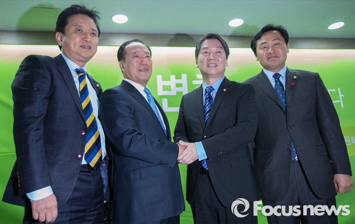 (서울=포커스뉴스) 국민의당(가칭)에 새롭게 합류한 김봉수 전 키움증권 부회장이 19일 오전 서울 마포구 국민의당 당사에서 안철수 인재영입위원장과 인사를 나누고 있다. 왼쪽부터 김영환 의원, 김봉수 전 키움증권 부회장, 안철수 국민의당 인재영입위원장, 김관영 디지털정당위원장.