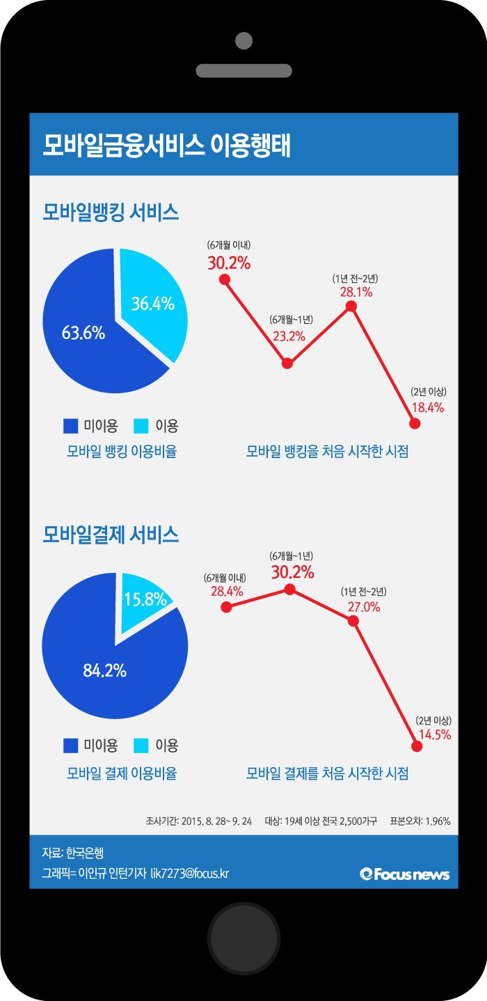 (서울=포커스뉴스) 19일 한국은행이 발표한 '2015년 모바일금융서비스 이용행태 조사결과 및 시사점'에 따르면 최근 6개월 동안 모바일뱅킹 서비스를 이용한 조사대상자 비율은 36.4%로 집계됐다. 반면 같은 기간 모바일로 실제 결제를 한 이용자 비율은 15.8%였다.