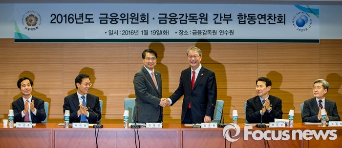 (서울=포커스뉴스) 임종룡 금융위원회 위원장과 진웅섭 금융감독원장이 19일 오후 서울 종로구 금융감독원 연수원에서 열린 '금융위원회-금융감독원 간부 합동연찬회'에 자리해 악수 하고 있다.