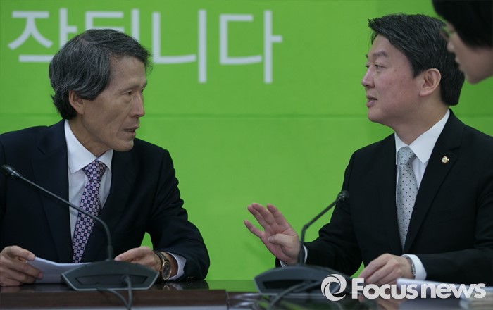 (서울=포커스뉴스) 20일 오전 서울 마포구 국민의당 당사에서 열린 기조회의에 참석한 한상진 공동창준위원장과 안철수 인재영입위원장이 대화를 나누고 있다.