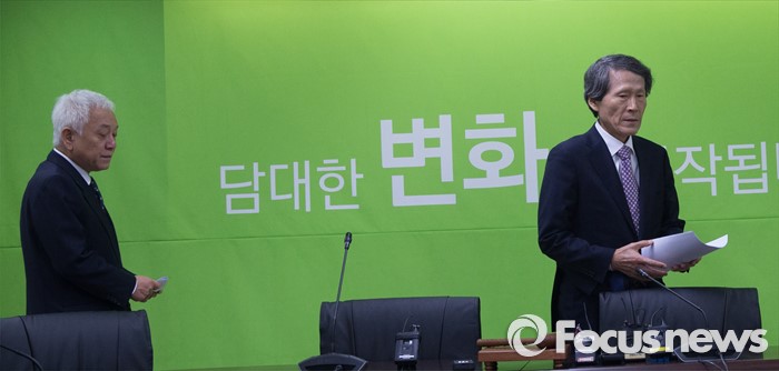(서울=포커스뉴스) 한상진 공동창준위원장과 김한길 상임 부위원장이 20일 오전 서울 마포구 국민의당 당사에서 열린 기조회의에 참석하고 있다.