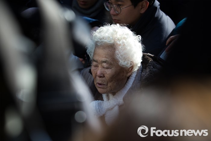 (서울=포커스뉴스) 책 '제국의 위안부'를 써 일본군 위안부 피해자들의 명예를 훼손했다는 혐의로 재판을 받게 된 박유하 세종대 국제학부 교수에 대한 공판이 열린 20일 오전 서울 광진구 동부지방법원에서 공판이 끝난 뒤 위안부 피해자 이옥선 할머니가 취재진의 질문을 듣고 있다.