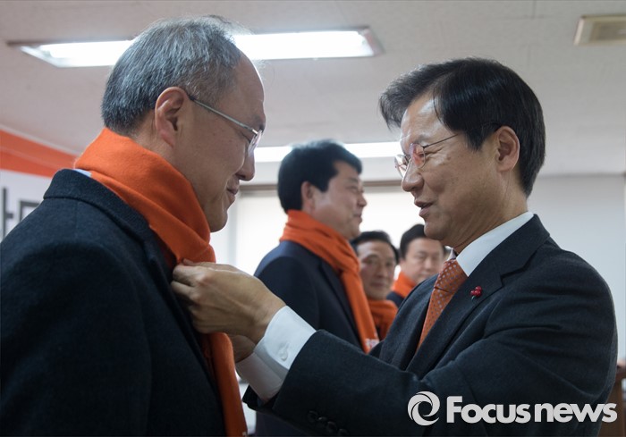 (서울=포커스뉴스) 국민회의 천정배 창당준비위원장이 20일 오후 서울 여의도 국민회의 당사에서 열린 인재 입당식에서 통일/노동 분야 5명의 인사들에게 목도리를 선물하고 있다.