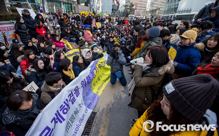 (서울=포커스뉴스) 20일 오후 서울 종로구 옛 일본대사관 앞에서 열린 제1214차 일본군 위안부 문제 해결 위한 정기수요시위에서 참가자들이 한일 위안부 합의 무효를 촉구 하고 있다. 이날 일본군 위안부 피해자 할머니들은 연이은 혹한으로 시위에 자리하지 못했다.