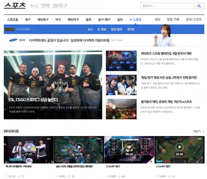 한편, 다음 스포츠는 프로야구를 비롯해 ▲메이저리그(MLB), ▲잉글리시프리미어리그(EPL), ▲스페인 프리메라리가, ▲UEFA 챔피언스리그 등 다양한 국내외 스포츠 경기를 PC와 모바일로 생중계하며 스포츠팬들의 니즈를 충족시키고 있다. 지난해에는 아쉽게 경기를 놓친 팬들을 위해 쉽고 빠르게 경기 내용을 요약해주는 '3분 야구', '3분 축구'를 선보인 바 있다.다음 스포츠 e스포츠 섹션 <사진제공=카카오>