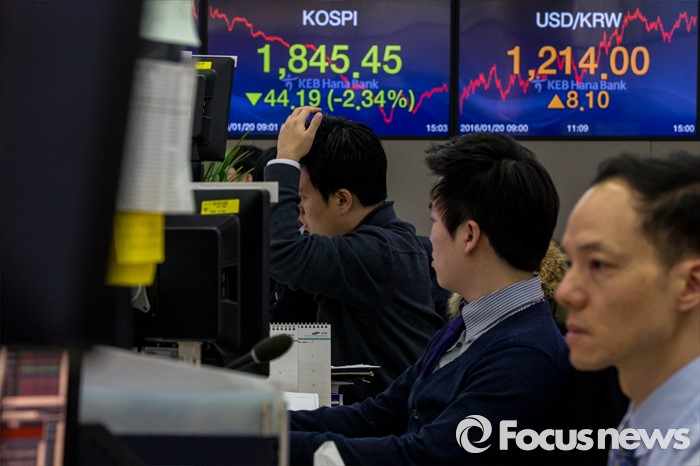 (서울=포커스뉴스) 코스피 지수가 외국인과 기관의 매도 공세에 전 거래일보다 44.19포인트(2.34%) 하락한 1,845.45에 거래를 마친 20일 오후 서울 중구 KEB하나은행 딜링룸에서 딜러들이 업무를 보고 있다. 이날 원달러 환율은 전 거래일보다 8.1원 오른 1214원에 거래를 마감했다.