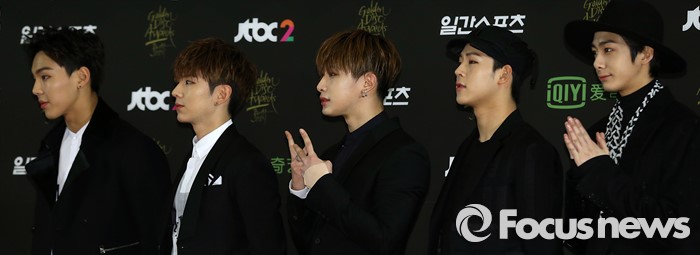 (서울=포커스뉴스) 20일 서울 동대문구 경희대학교 평화의 전당에서 열린 제 30회 골든디스크 시상식에 참석한 아이돌 그룹 몬스타 엑스의 멤버들이 포토타임을 갖고 있다.