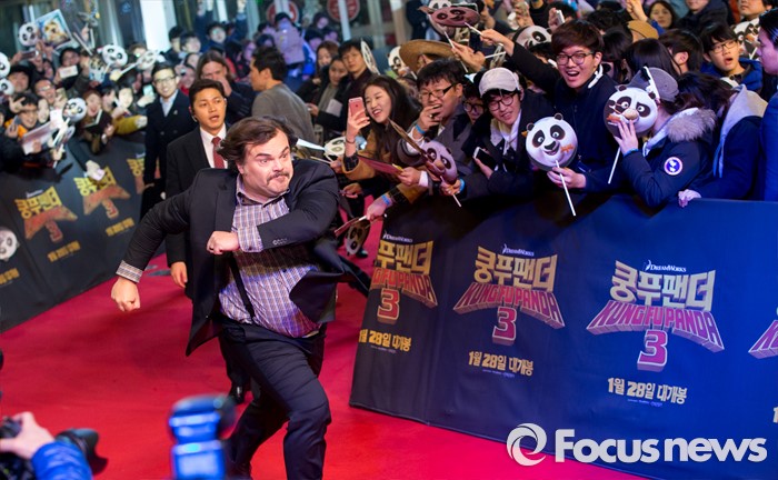 (서울=포커스뉴스) 할리우드 애니메이션 '쿵푸팬더 3' 홍보차 내한한 배우 잭 블랙이 20일 오후 서울 영등포구 타임스퀘어에서 열린 레드카펫 행사에 참석해 팬들을 향해 달려가고 있다.