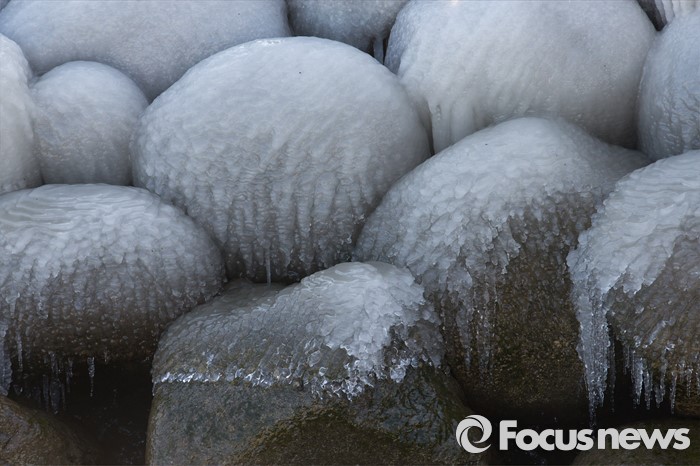 | △ 강추위에 얼어붙은 한강변 바위 |