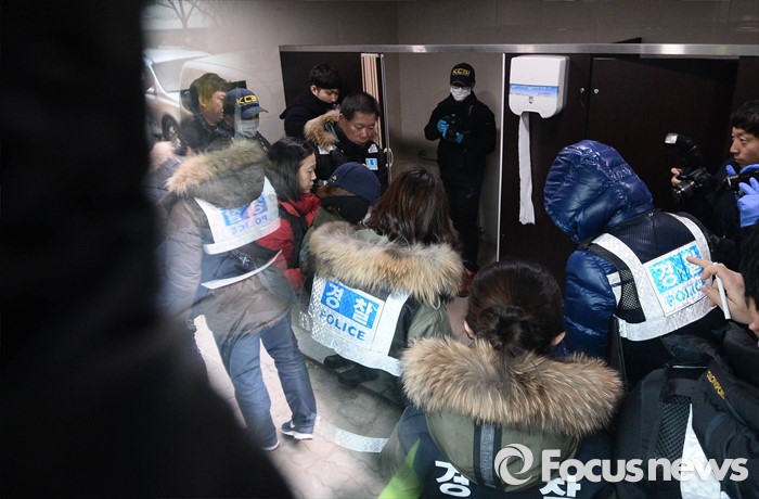 (부천=포커스뉴스) 부천 초등생 살해사건의 첫번째 현장검증이 실시된 21일 오전 부천 원미구 시민회관 화장실에서 피의자 한모 (33)씨가 범행 상황을 재연하고 있다.