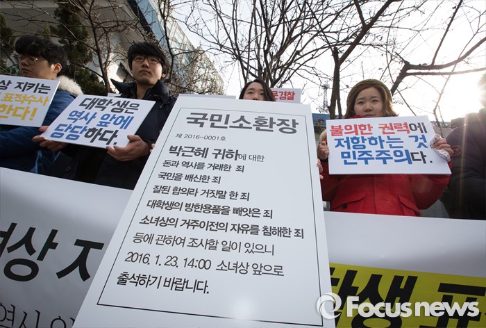 (서울=포커스뉴스) 한일 위안부 협상 폐기를 요구하며 주한일본대사관 앞 '평화의 소녀상' 인근에서 노숙 농성과 집회를 벌인 혐의로 출석요구서를 받은 대학생들이 21일 오후 종로구 종로경찰서 앞에서 개최한 '소녀상을 지키는 대학생 표적수사 규탄 기자회견'에서 박근혜 대통령에게 보내는 국민소환장을 공개하고 있다.