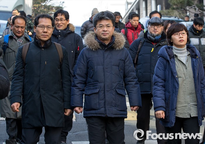 (서울=포커스뉴스) 21일 오후 서울 서초구 서울고등법원 별관에서 열린 법외노조 통보처분 취소소송 항소심을 마친 변성호 전국교직원노동조합 위원장이 기자회견장으로 향하고 있다.