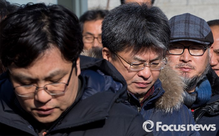 (서울=포커스뉴스) 21일 오후 서울 서초구 서울중앙지방법원 인근에서 열린 법외노조 통보처분 취소청구 고법 판결에 대한 전교조 입장 발표 기자회견에서 변성호 전국교직원노동조합 위원장을 비롯한 노조원들이 굳은 표정을 짓고 있다.