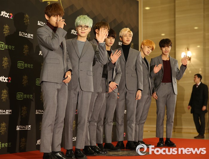 (서울=포커스뉴스) 21일 서울 동대문구 경희대학교 평화의 전당에서 열린 제 30회 골든디스크 시상식에 참석한 아이돌그룹 방탄소년단이 포토타임을 갖고 있다.