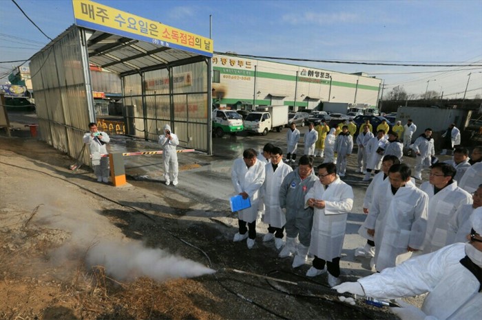 (평택=포커스뉴스) 이동필 농림축산식품부장관이 21일 오후 경기도 평택 평농푸드도축장을 방문해 구제역 방역실태를 점검하고 있다. <사진제공=농림축산식품부>