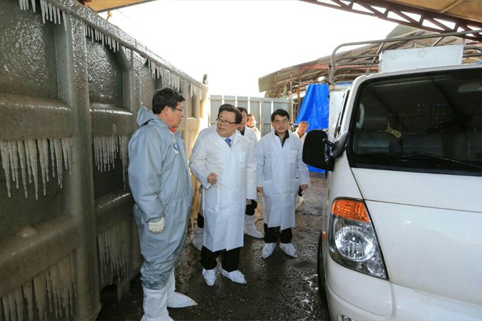 (평택=포커스뉴스) 이동필 농림축산식품부장관이 21일 오후 경기도 평택 평농푸드도축장을 방문해 구제역 방역실태를 점검하고 있다. <사진제공=농림축산식품부>