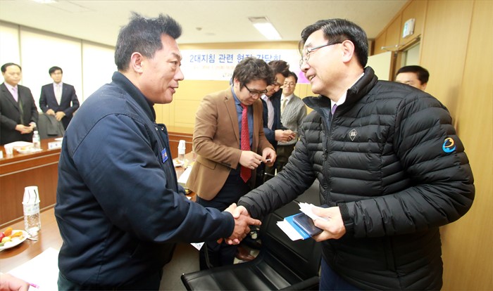 (수원=포커스뉴스)이기권 고용노동부 장관이21일 오후 경기 수원 팔달구 경기고용노동청 4층회의실에서 경기지역 노사간담회를 앞두고 참석자와 악수를 하고 있다. <사진제공=고용노동부>