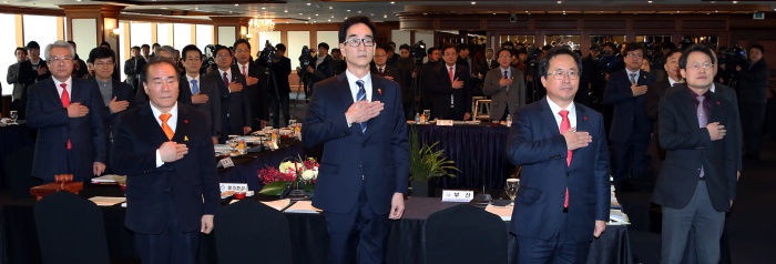 (부산=포커스뉴스) 이준식 교육부 장관이 21일 오후 부산 해운대 그랜드호텔에서 열린 전국 시·도교육감협의회 총회에 참석해 국기에 대한 경례를 하고 있다. <사진제공=교육부>