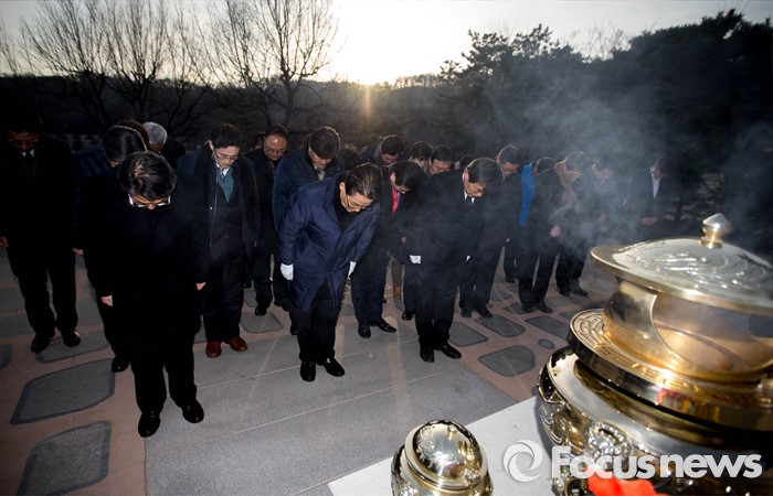 (서울=포커스뉴스) 더불어민주당 탈당을 예고한 박지원 전 원내대표가 22일 오전 서울 동작구 국립서울현충원 故 김대중 전 대통령 묘역을 방문, 참배 후 묵념을 하고 있다.