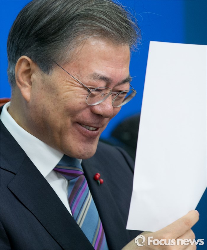 (서울=포커스뉴스) 문재인 더불어민주당 대표가 22일 오전 서울 여의도 국회에서 열린 최고위원회의에 참석해 중앙선거대책위 구성안을 보며 대화 중 미소 짓고 있다.