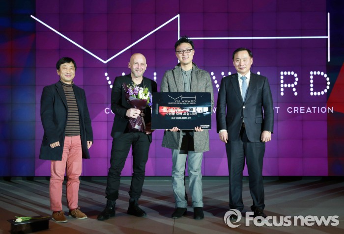 현대차그룹 관계자는 "VH 어워드가 문화예술계 저변 확대에 기여할 수 있기를 기대하며, 그룹사 임직원들이 다양한 문화예술을 체험할 수 있도록 지속적으로 창의적인 콘텐츠 발굴을 이어갈 것"이라고 말했다.21일 경기도 용인 현대차그룹 인재개발원 마북캠퍼스에서 열린 '제 1회 VH 어워드 시상식'에 참가한 (왼쪽부터) 최흥철 큐레이터, 마틴 혼직 큐레이터, 박제성 작가, 현대차그룹 한성권 인재개발원장이 시상식 후 기념 사진을 찍고 있다. <사진제공=현대차그룹> 2016.1.22. 김현이 인턴기자