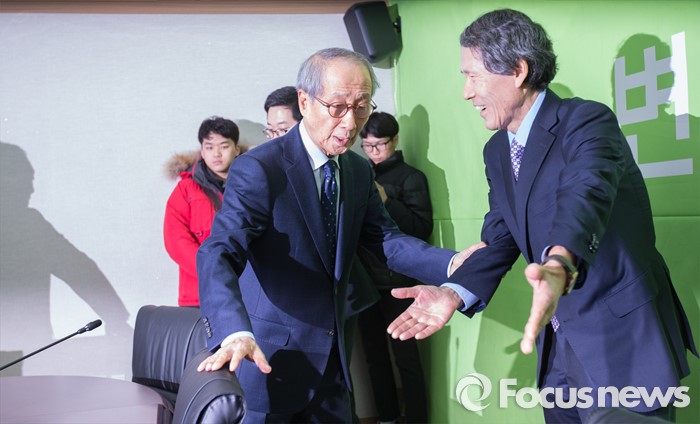 (서울=포커스뉴스) 윤여준(왼쪽), 한상진 국민의당 공동 창당준비위원장이 22일 오전 서울 마포구 당사에서 열린 기획조정회의에서 자리를 양보하고 있다.
