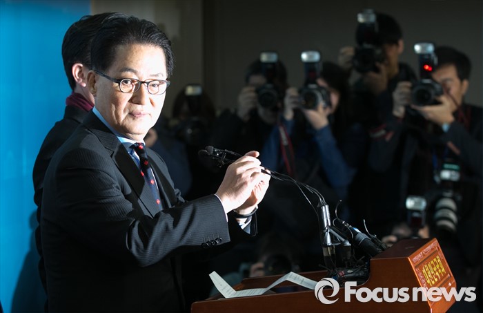 (서울=포커스뉴스) 박지원 더불어민주당 의원이 22일 오전 서울 여의도 국회 정론관에서 탈당 기자회견을 하고 있다.