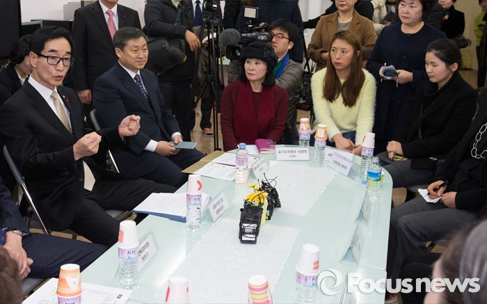 (서울=포커스뉴스) 이준식(왼쪽) 사회부총리 겸 교육부장관이 22일 오전 서울 용산구 일민유치원에서 유치원과 어린이집 관계자 및 학부모와 누리과정 교육비 지원에 대한 간담회를 갖고 있다.
