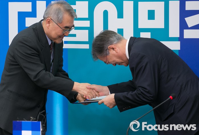 (서울=포커스뉴스) 문재인(오른쪽) 더불어민주당 대표가 22일 오후 서울 여의도 국회에서 열린 인재영입 기자회견에 참석해 박근혜 대선 캠프 출신인 양봉민 서울대 보건학과 교수로부터 입당원서를 전달받고 있다. 양 교수는 지난 18대 대선에서 새누리당이 경제민주화를 위해 구성한 국민행복추진위원회에 참여했던 인물이며, 박 대통령의 보건복지 공약을 만든 '편안한 삶 추진단'의 보건의료팀장을 맡았었다.