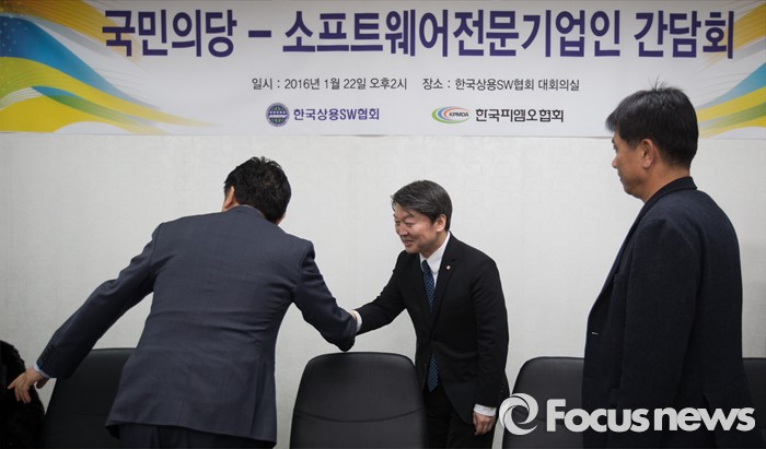 (서울=포커스뉴스) 국민의당(가칭) 안철수 의원이 22일 오후 서울 구로구 한국상용 SW협회에서 열린 SW전문기업인들과의 간담회에서 기업인들과 인사를 나누고 있다.