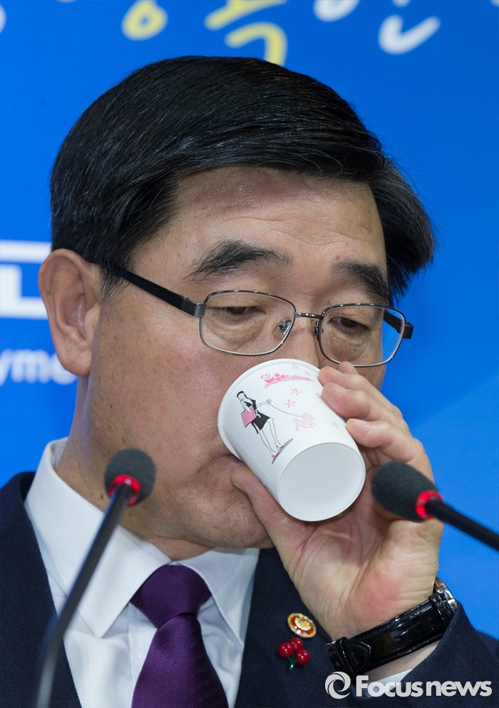 (세종=포커스뉴스) 이기권 고용노동부장관이 22일 오후 세종시 정부세종청사 보건복지부 브리핑룸에서 '일반 해고' 및 '취업규칙 변경요건 완화' 등 양대 지침에 대한 최종안 발표중 목을 축이고 있다.