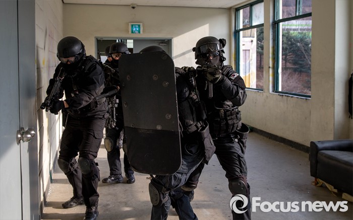 (서울=포커스뉴스) 22일 오후 서울 경찰특공대 훈련장에서 테러상황에 대비한 경찰, 소방, 군 전력이 함께 한 합동훈련이 실시된 가운데 경찰특공대 대원들이 테러범에 의한 인질상항 등을 가정한 훈련을 진행하고 있다.