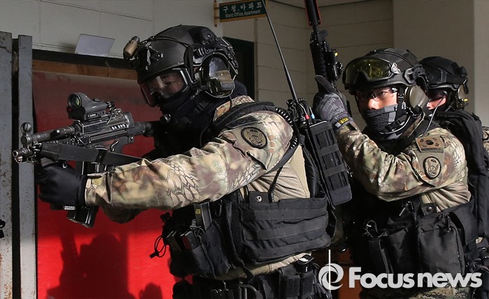 (서울=포커스뉴스) 김신조 청와대 침투사건인 ‘1·21사태’ 48주년을 맞아 서울경찰청·소방재난본부·수도방위사령부가 합동으로 수도 서울을 지키기 위한 테러 진압 훈련을 실시한 22일 서울 서초구 경찰특공대 훈련장에서 군 테러 진압 부대가 인질범 진압 작전을 펼치고 있다.