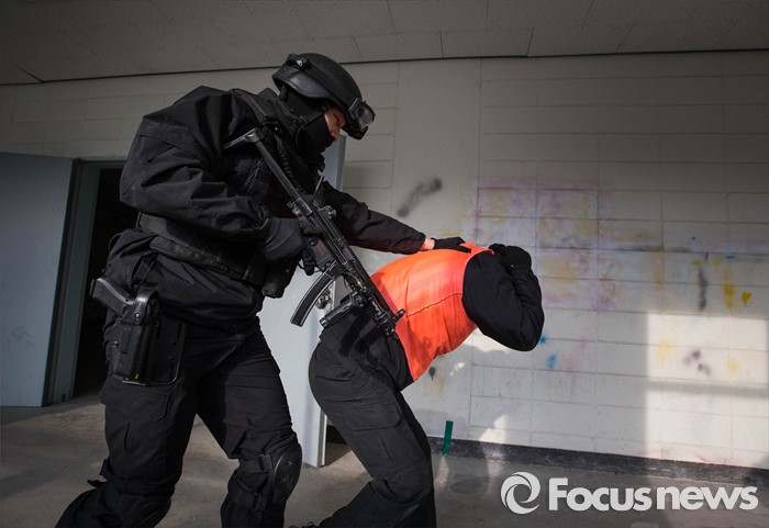 (서울=포커스뉴스) 22일 오후 서울 경찰특공대 훈련장에서 테러상황에 대비한 경찰, 소방, 군 전력이 함께 한 합동훈련이 실시된 가운데 경찰특공대 대원들이 테러범에 의한 인질상항 등을 가정한 훈련을 진행하고 있다.