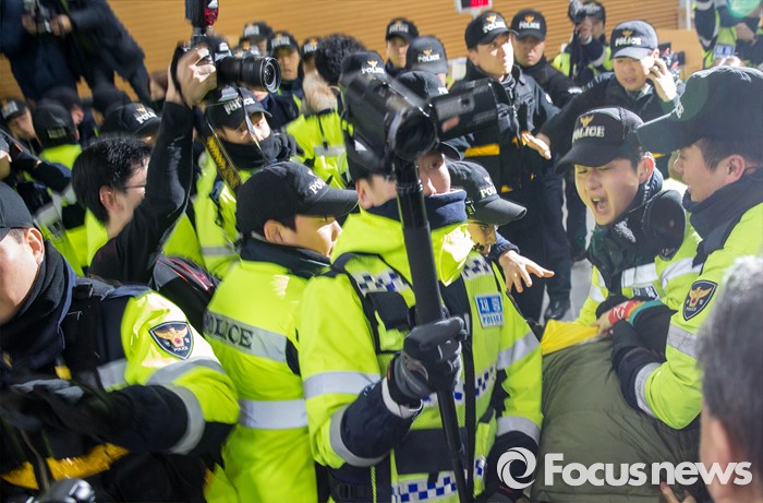 (서울=포커스뉴스) 22일 오후 서울 중구 서울고용노동청을 민원실을 점거한 알바노조원들이 경찰과 충돌하고 있다. 알바노조 조합원 100여명은 근로감독관 일처리 개선을 촉구하며 노동청을 기습 점거했다.