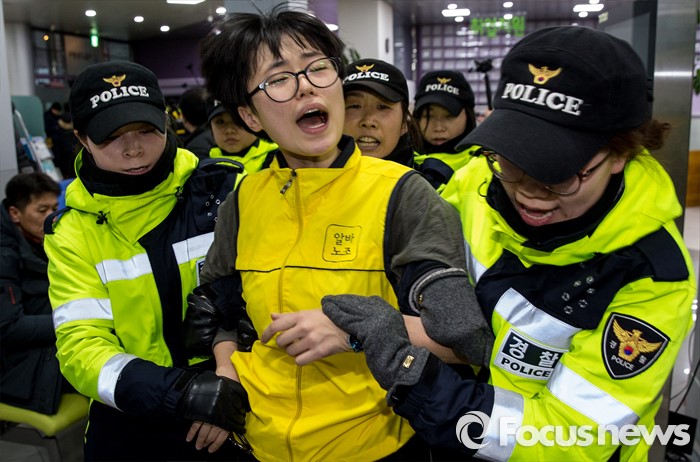 (서울=포커스뉴스) 22일 오후 서울 중구 서울고용노동청을 민원실을 점거한 알바노조원들이 경찰과 충돌, 용윤심 사무국장이 연행되고 있다. 알바노조 조합원 100여명은 근로감독관 일처리 개선을 촉구하며 노동청을 기습 점거했다.