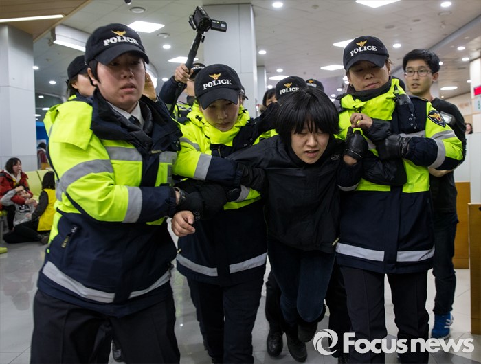(서울=포커스뉴스) 22일 오후 서울 중구 서울고용노동청을 민원실을 점거한 알바노조원이 경찰에 연행되고 있다. 알바노조 조합원 100여명은 근로감독관 일처리 개선을 촉구하며 노동청을 기습 점거했다.