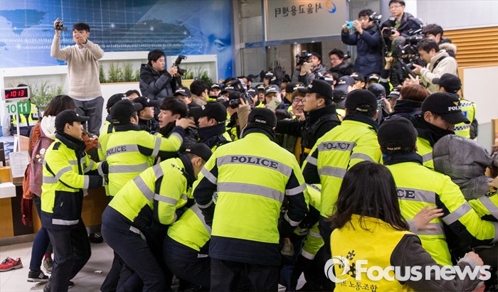 (서울=포커스뉴스) 22일 오후 서울 중구 서울고용노동청을 민원실을 점거한 알바노조원들이 경찰과 충돌하고 있다. 알바노조 조합원 100여명은 근로감독관 일처리 개선을 촉구하며 노동청을 기습 점거했다.