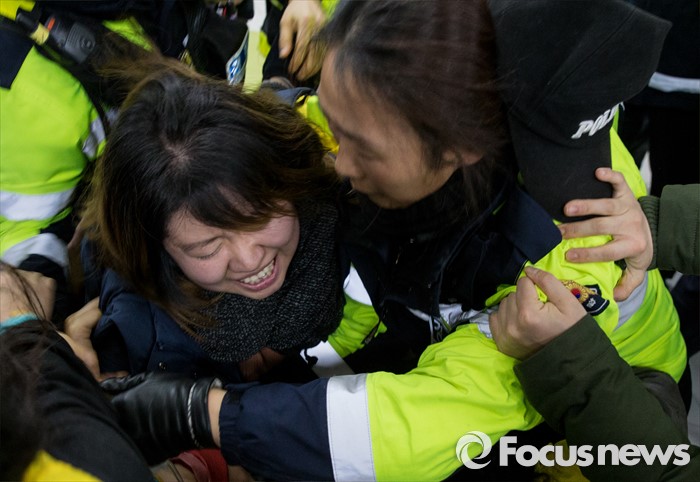 (서울=포커스뉴스) 22일 오후 서울 중구 서울고용노동청을 민원실을 점거한 알바노조원들이 경찰과 충돌하고 있다. 알바노조 조합원 100여명은 근로감독관 일처리 개선을 촉구하며 노동청을 기습 점거했다.
