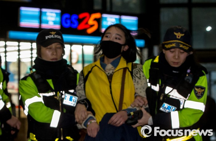 (서울=포커스뉴스) 22일 오후 서울 중구 서울고용노동청을 민원실을 점거한 알바노조원이 경찰에 연행되고 있다. 알바노조 조합원 100여명은 근로감독관 일처리 개선을 촉구하며 노동청을 기습 점거했다.